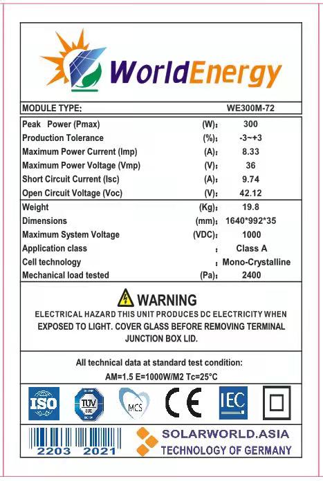 Thông số kỹ thuật TẤM PIN NĂNG LƯỢNG MẶT TRỜI MONO 300W WORLD ENERGY