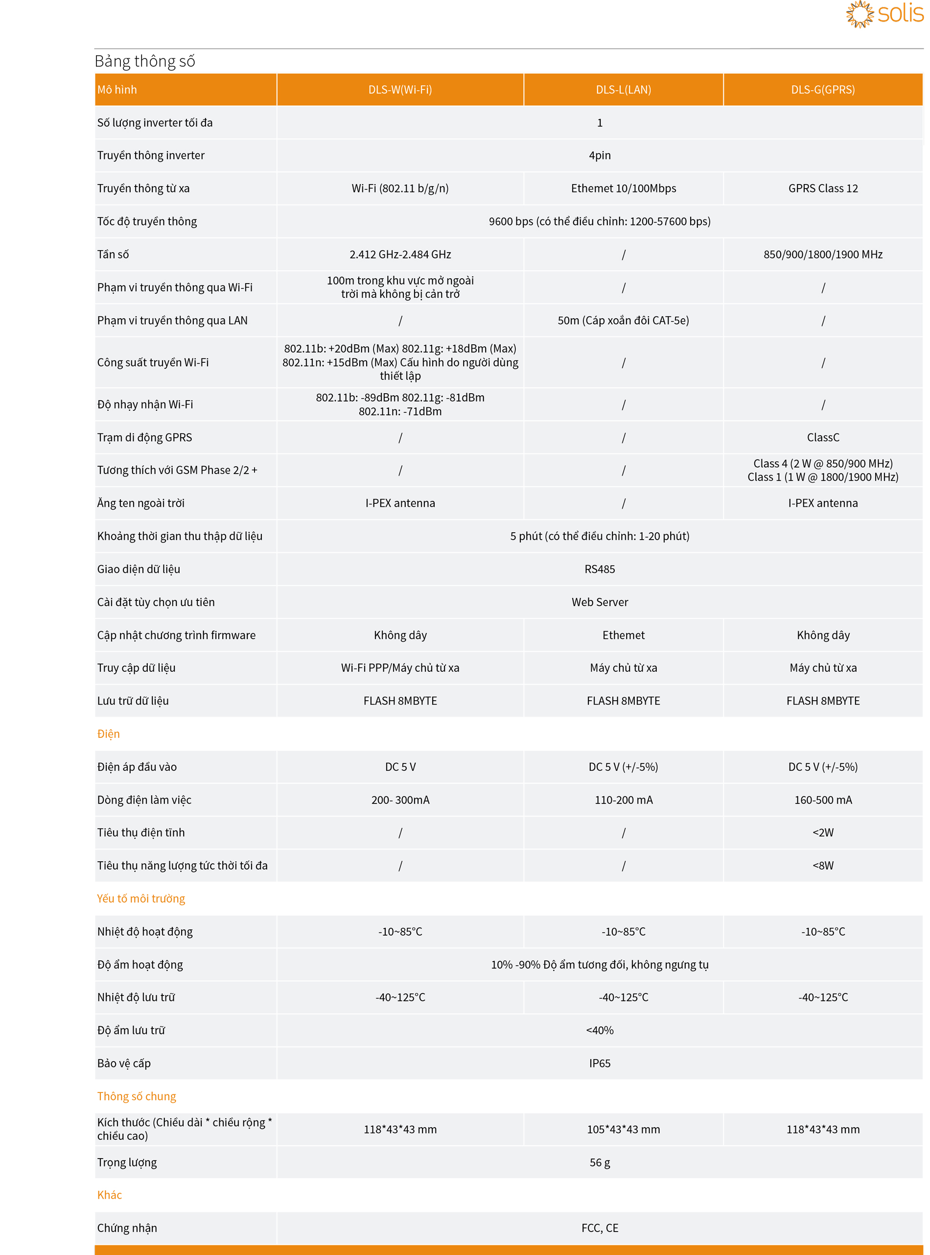 Thông số kỹ thuật Thiết bị Wifi giám sát từ xa Inverter Solis (Data Logging Stick)
